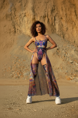 The Trifecta: Includes the fully printed Bodysuit, the flowy Mesh Flare Leg Panels, and matching printed Thigh-Highs.