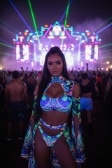 Electric Empress Psychedelic Festival Set | Slit-Sleeve Keyhole Crop Top & High-Cut Skirt/Booty Shorts Combo