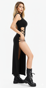 Looking to make a statement? This Black Lace-Up Side Slit Maxi Dress is here to turn heads and give you that confidence boost you’ve been waiting for. With its bold side lace-up details and daring thigh-high slit, this dress is all about adding a fierce edge to your wardrobe. Whether you're out on the town or just looking to stand out, this dress brings the perfect mix of sultry and sophistication.