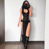 Shadow Veil Hooded Maxi Dress - Sheer Mesh High-Slit Cover-Up